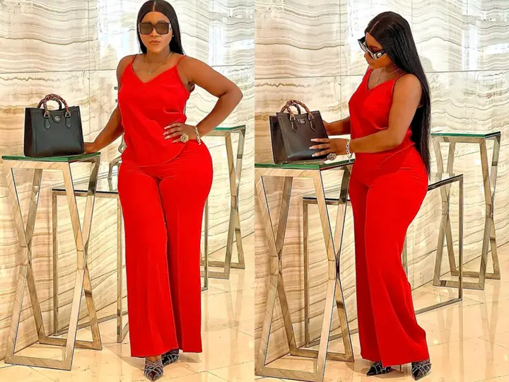 Nollywood star, Destiny Etiko flaunted her beauty earlier in a stunning red outfit, she can be seen comfortably slaying in a red sleeveless top and pantsuits, black bag, heels and shades.