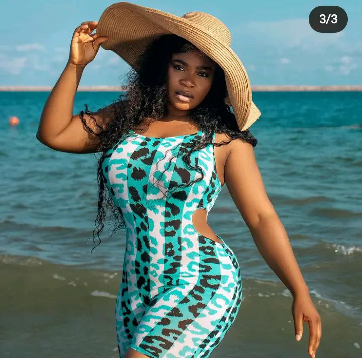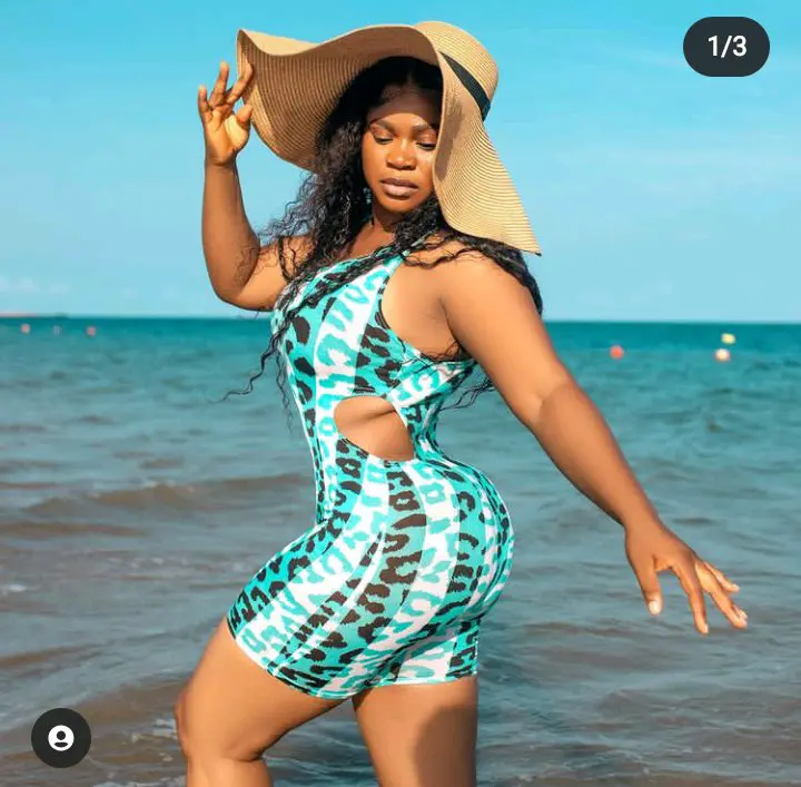 Popular Yoruba actress, Eniola Ajao sparked reactions on social media earlier this week after she shared new adorable pictures of herself on her official Instagram page, the movie star can be seen chilling on the beach while dressed in a stylish one-piece swimsuit and a sunhat.