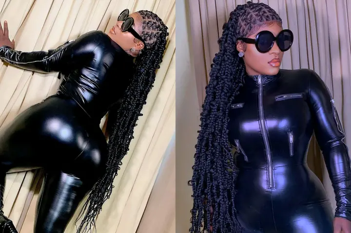 Destiny Etiko took to her verified Instagram page earlier today to share some new photos of herself she took during a recent photoshoot session, she looked incredible as she showed off her beauty dressed up in a tight leather jumpsuit, she can also be seen rocking ankle high heels, dark shades and long braided hair.