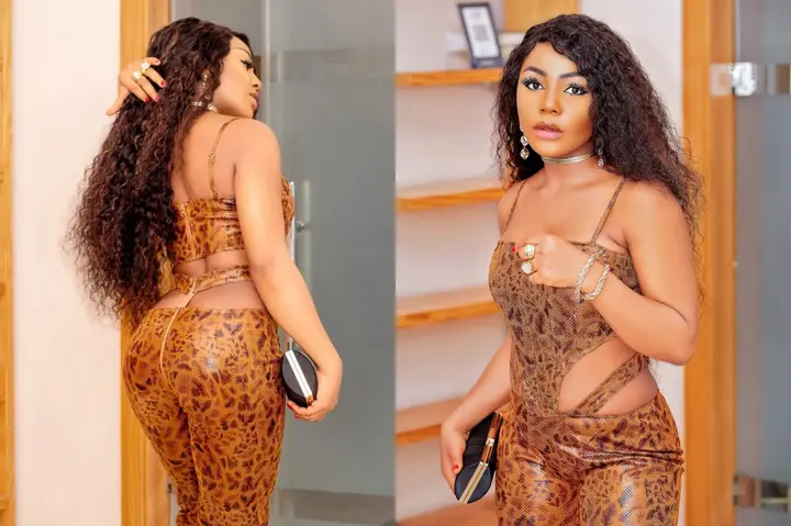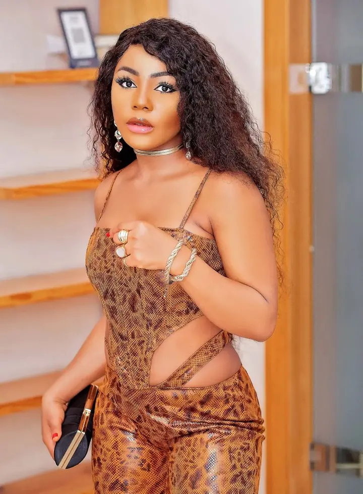 Ifu Ennada has stirred up reactions on her official Instagram page after she dropped some eye-catching pictures of herself, in the photos she wore a brown colored, one-piece jumpsuit that brings out her curves.