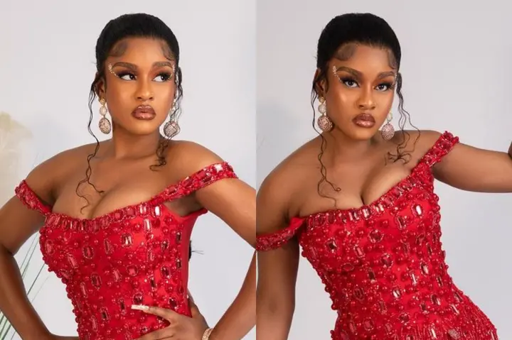 Phyna logged in to her personal Instagram page a few moments ago to stun internet surfers on the platform with eye-catching pictures of herself flaunting her mesmerizing beauty in a stylish wear, the reality television star can be seen posing effortlessly beside a plant while dressed up in a glittery, short, red gown.