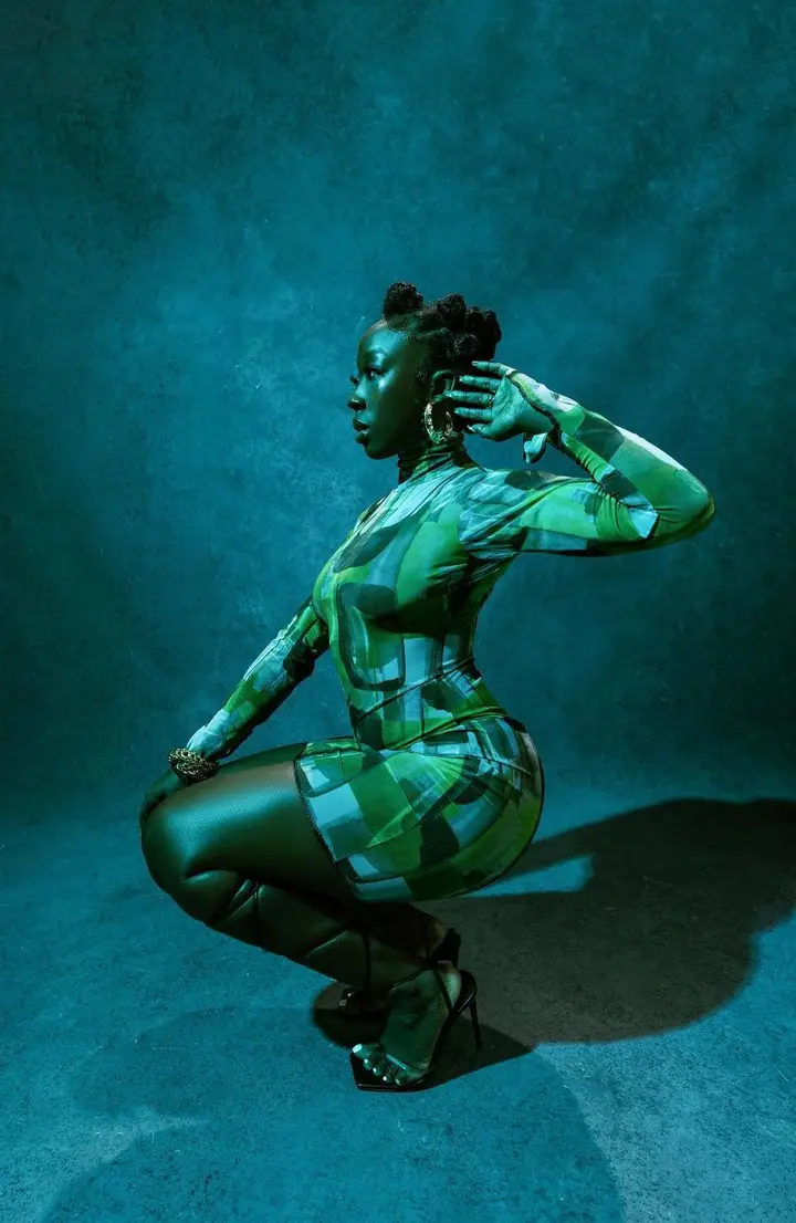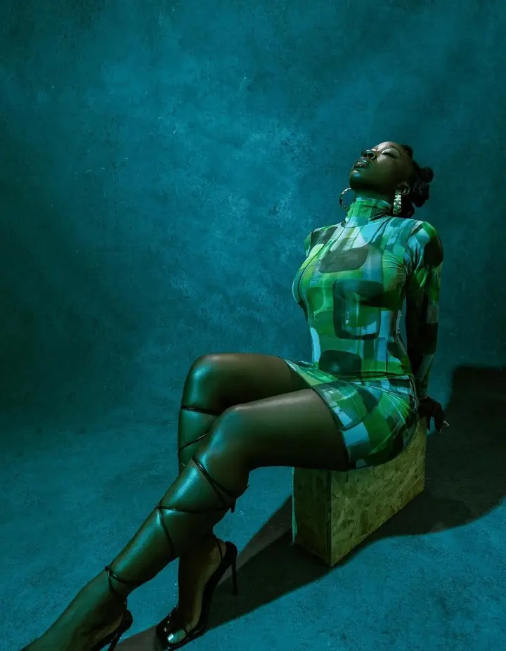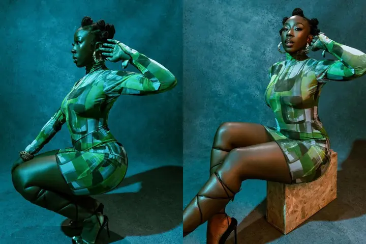 In the photos she shared, the actress can be seen looking gorgeous as she slays effortlessly in a stylish, green, turtle neck, short bodycon gown.