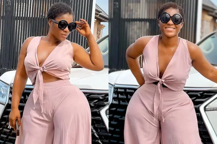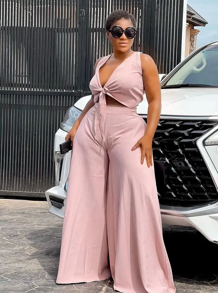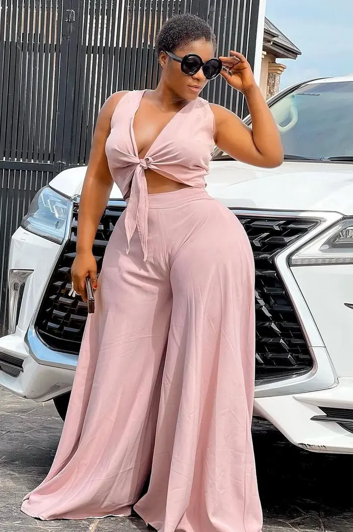Destiny Etiko has always been one of the top fashionistas in Nigeria and she proves just how stylish she can be with most of her posts on social media. The Nollywood actress took to her verified Instagram handle recently to show off the latest outfit in her wardrobe, she can be seen posing in front of her expensive car while dressed up in a pink two-piece wear, she wore a tied crop top and matching flowing slacks