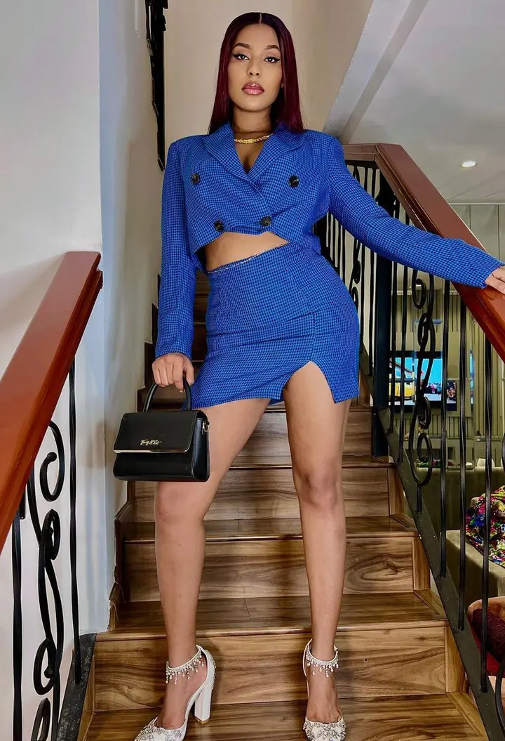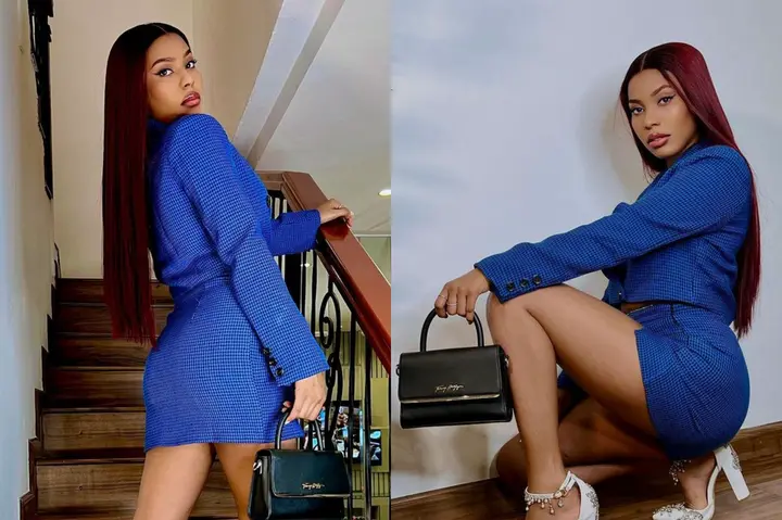 Nini Singh took to her verified Instagram account to drop an attention grabbing post. The reality TV star released a couple of pictures of herself looking cute and slaying in a gorgeous outfit, she was dressed up in a stylishly designed two piece suit outfit, she wore a blue, buttoned crop top and a split mini skirt. Nini also rocked a long bone straight hair, white heels and a small black bag.