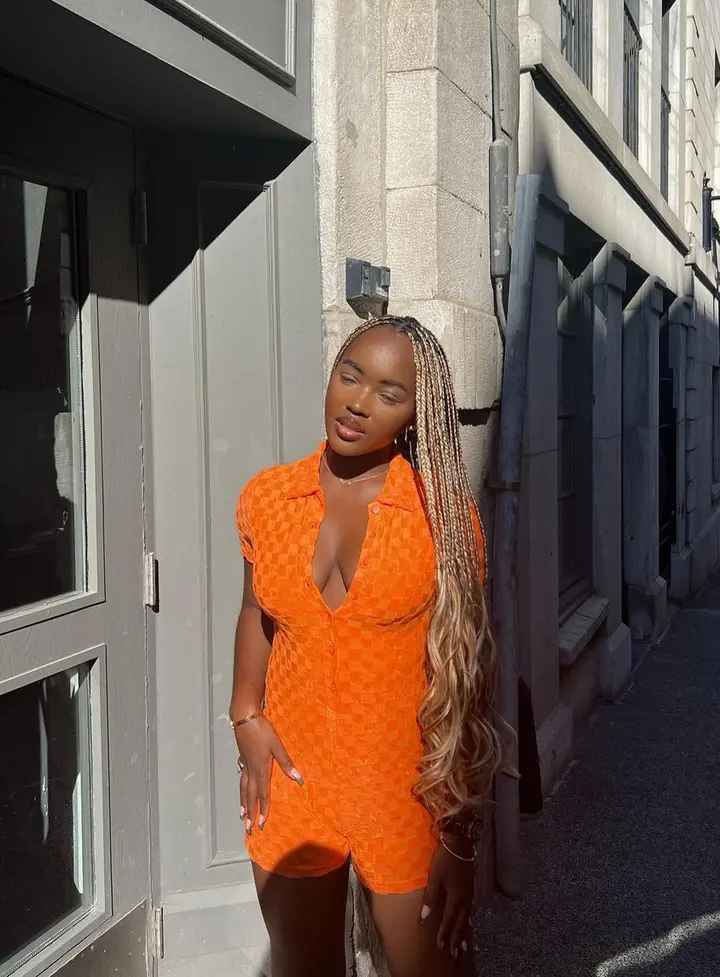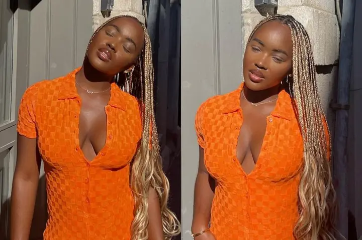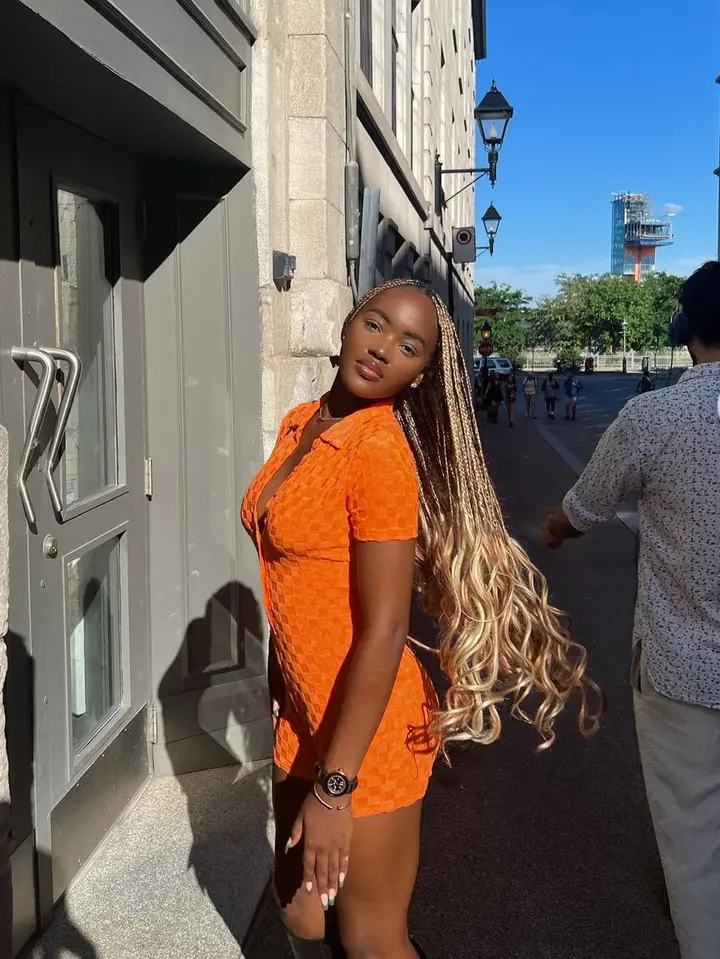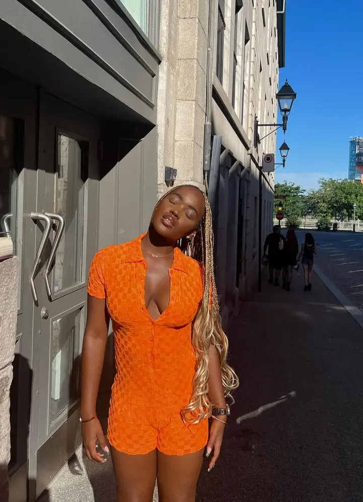 Michelle recently dropped a couple of new pictures on her verified Instagram page and she looked captivating as usual, she can be seen cruising on the streets dressed up in a short, orange, bodycon jumpsuit and rocking a long, blonde braided hair.