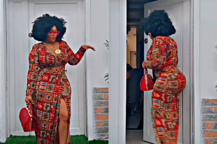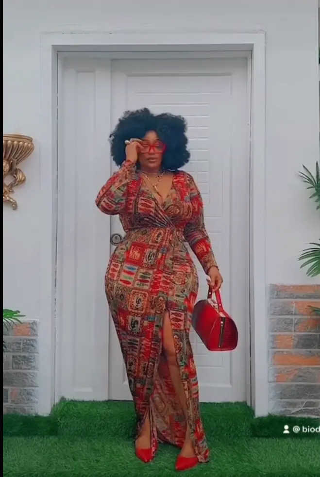 The movie star took to her verified Instagram account recently to drop a new video on her page, she can be seen flaunting her beauty and stunning outfit in the clip, she was dressed up in a chic, long, bodycon split dress, red heels and she also held a fine red bag.