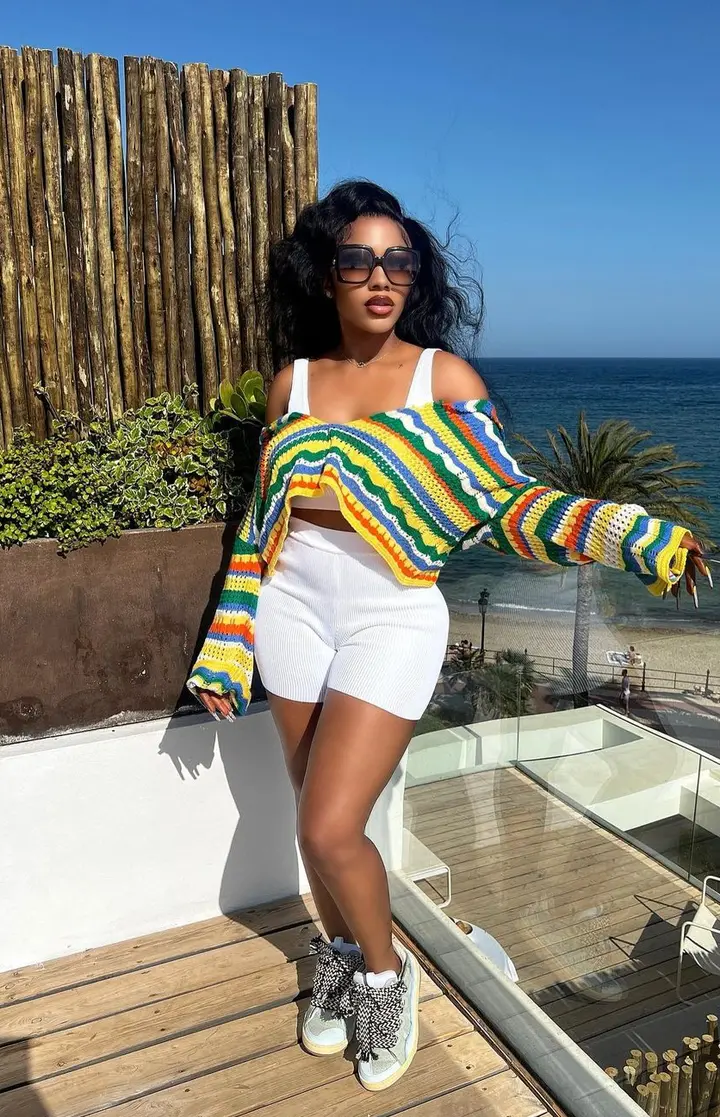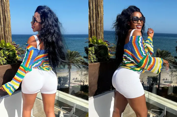 Mercy Eke dazzled fans recently on social media with some sultry photos of herself she shared on Instagram, she showed off her curves in a stunning outfit, she was dressed up in a colorful knitted top worn over a white crop top and short tights.