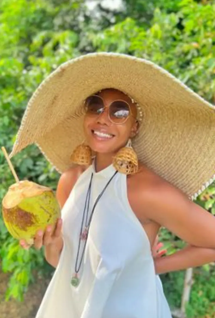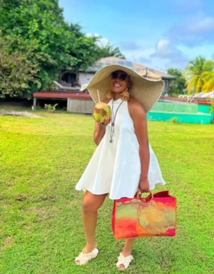 In the post, she was dressed up in a short, white gown and matching white shoes, she was also rocking a large sun hat and shades.