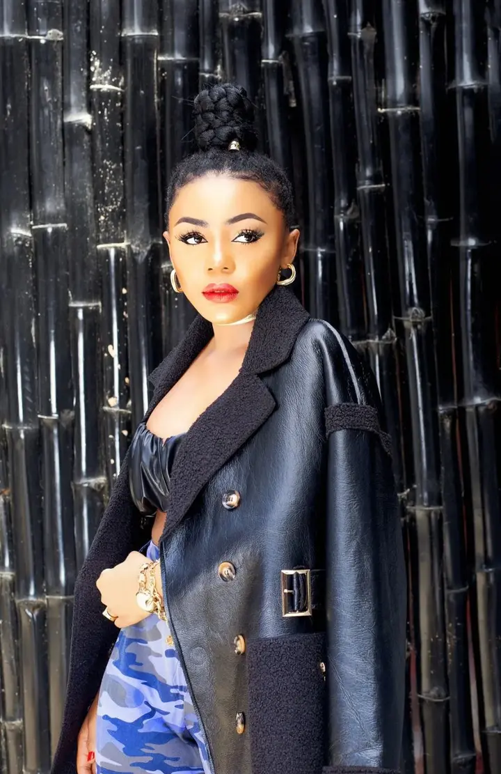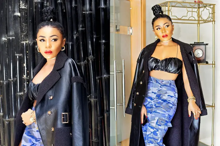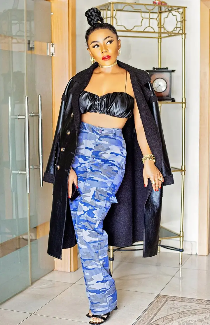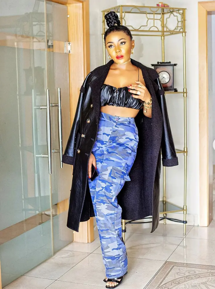 Ifuennada stunned fans recently on her official Instagram page after she posted some stunning photos of herself slaying effortlessly in a chic outfit, she wore a beautiful black leather jacket, a string top and blue camo slacks.