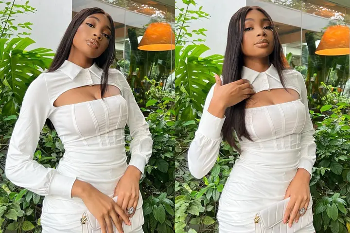 The influencer recently released new photos of herself on her verified Instagram page earlier today, she looked incredible as she flaunted her beauty while dressed up in a stunning white, long sleeved, bodycon short gown.