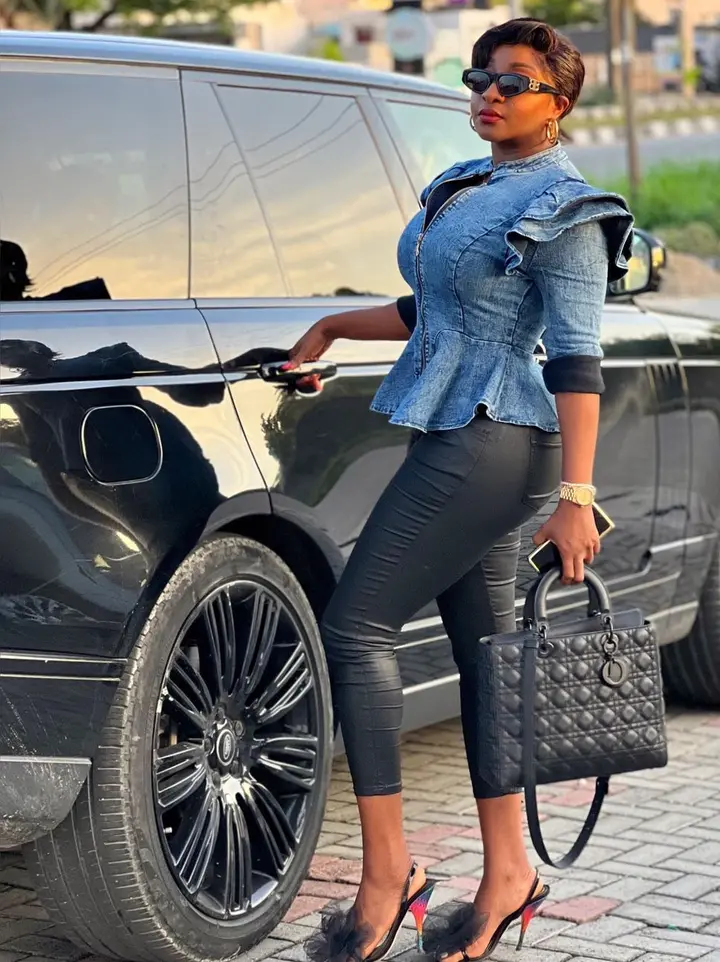 Ini Edo is no doubt one of the most fashionable women we have in the Nigerian entertainment industry, she blows people away with whatever she wears anytime she steps out. The Nollywood actress caught the attention of netizens as usual earlier today when she took to her personal Instagram handle to share new photos of herself rocking a stylish outfit, she looked stunning as she flaunted her beauty and physique in a well designed blue jean blouse and black leather tights.
