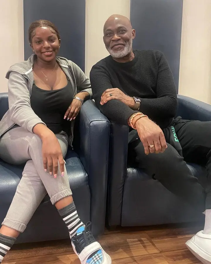 The BBNaija star released new photos on her Instagram page recently, she looked gorgeous as she slayed effortlessly in a grey hoodie and matching grey trousers, she can also be seen posing with veteran Nollywood actor, Richard Mode Damijo or RMD as he's also known.