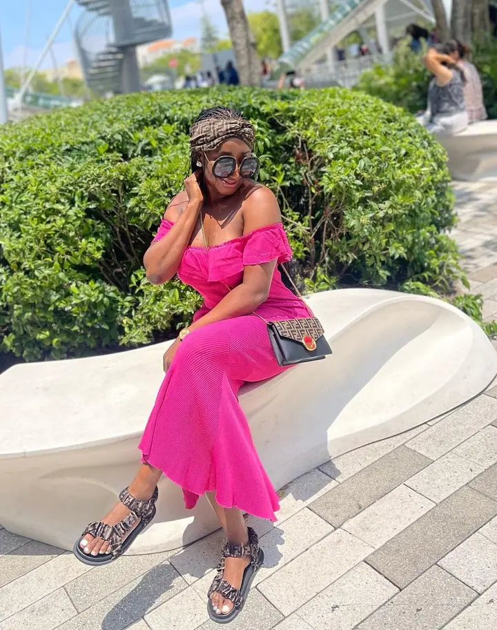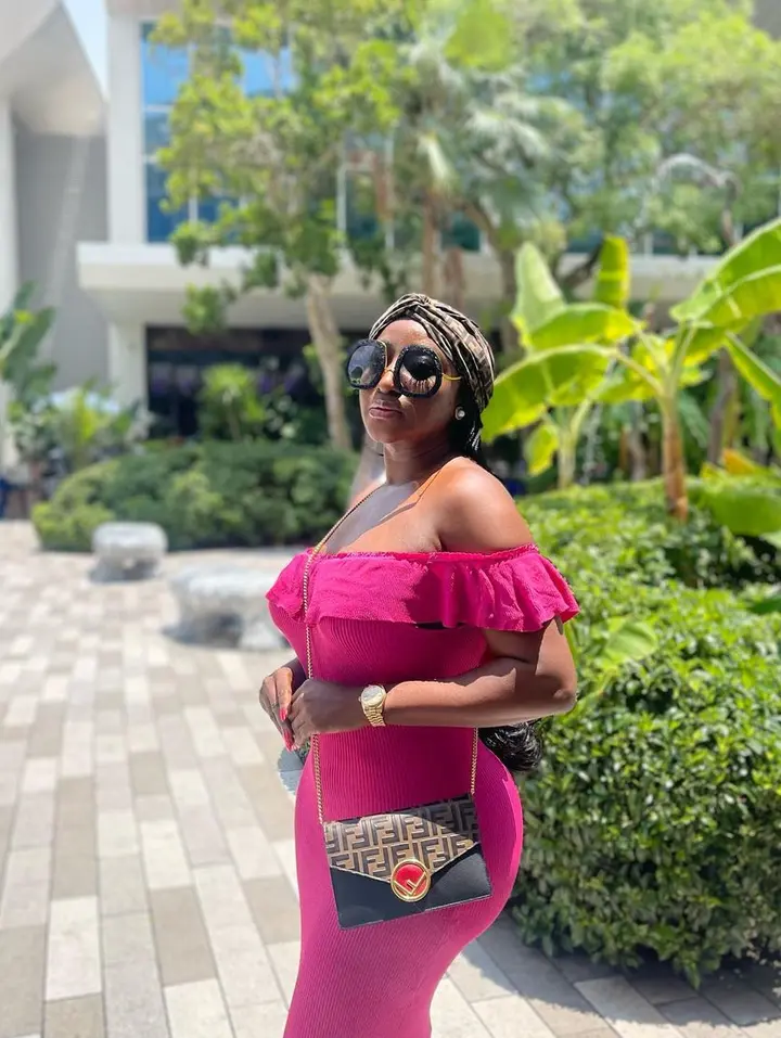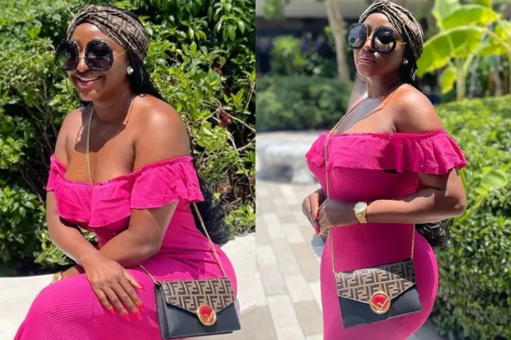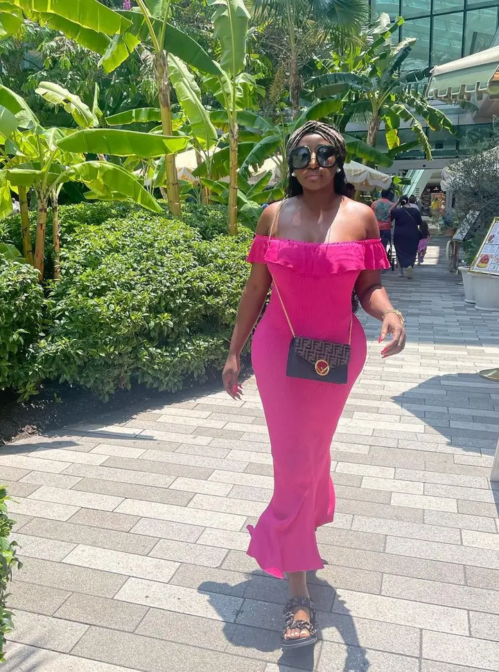 The film star recently dazzled fans on Instagram after she dropped some eye-catching photos of herself enjoying her vacation while she's all dressed up in a gorgeous outfit, she can be seen putting on a pink, open chest dress that fits her perfectly.
