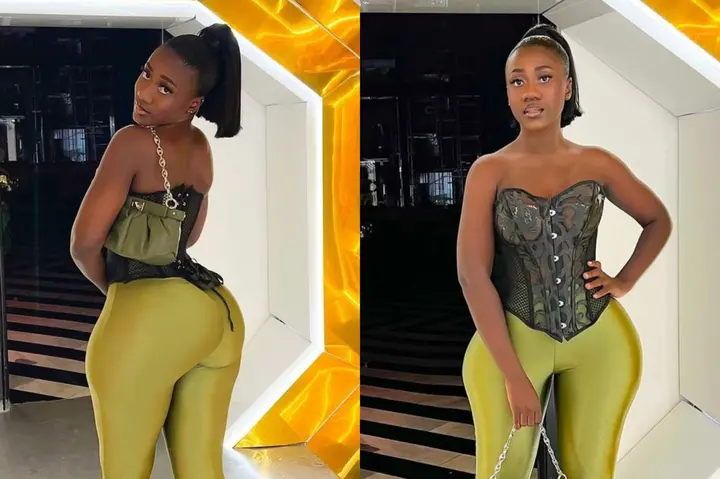 Ghanaian model, TikTok star and dancer, Hajia Bintu posted some sultry pictures of herself rocking an eye-catching attire recently, she got the attention of her followers as she showed off her curves in a black sleeveless top and green leggings.