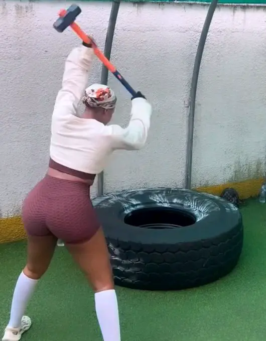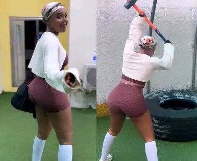 Nollywood actress, media personality and influencer, Nancy Isime recently showed off herself working out on her official Instagram page. Apart from being an actress, Nancy is also a fitness enthusiast and she loves to share pictures of herself working out on social media to encourage her fans. In a recent post she made, she can be seen exercising with a sledge hammer while she slays in a crop top and tight shorts.