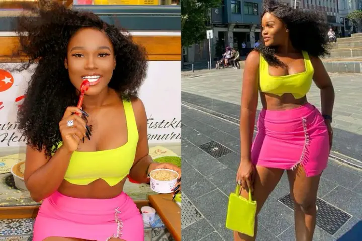 Former Big Brother Naija housemate popularly known as Cee Cee also wowed her fans with her new post, she can be seen slaying stylishly in a green sleeveless crop top and a pink skirt. The BBNaija star complimented her top with a matching green bag.