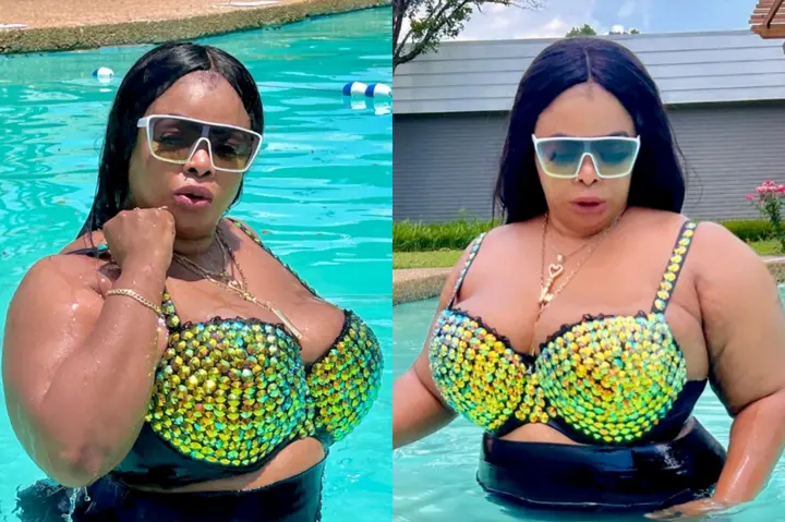 Yoruba actress, Dayo Amusa dazzled fans online as she shared new lovely pictures of herself, she can be seen having a swim in a pool while dressed up in a fashionable swimwear and shades.